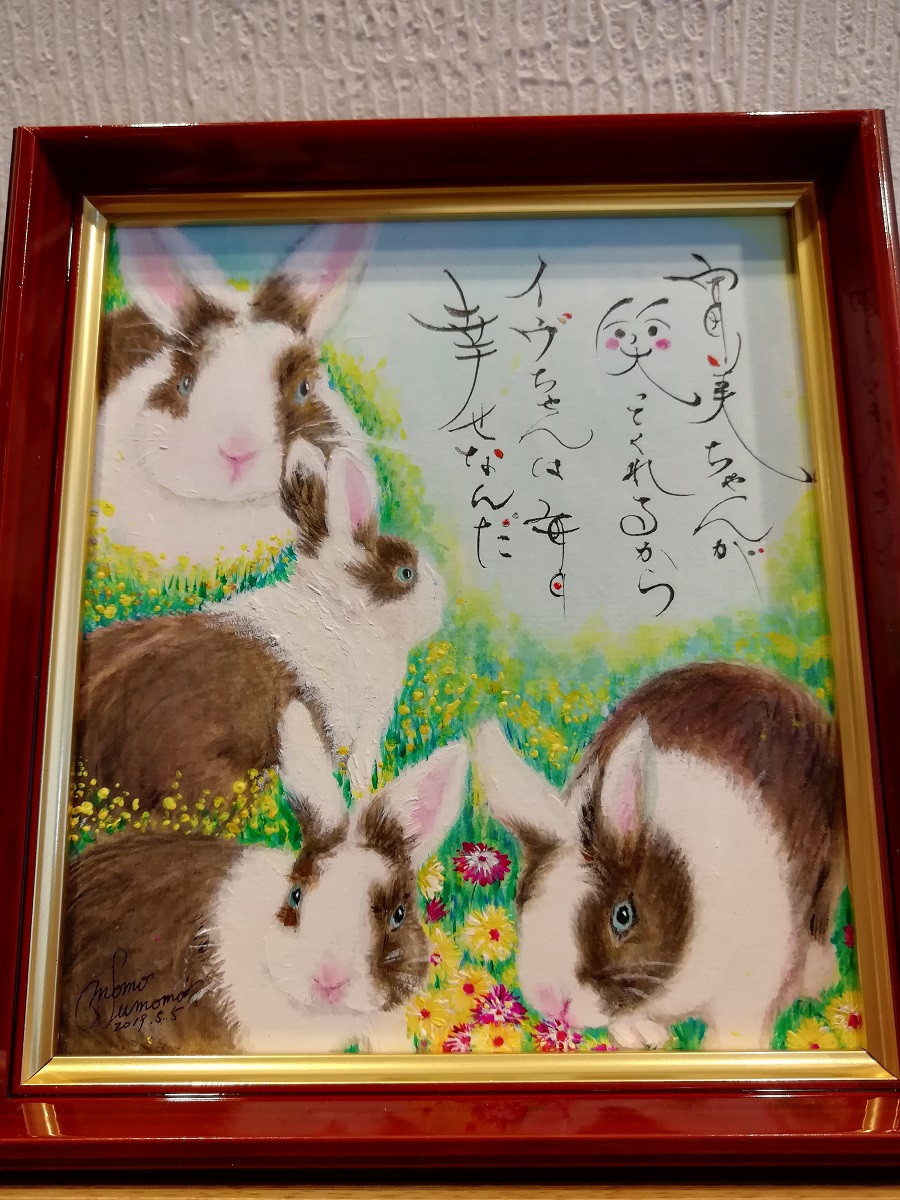F様が可愛がっているウサギのイヴちゃんを思い出し イヴは外せない!笑顔と癒しの源でしょう♡♡と絵は決定!